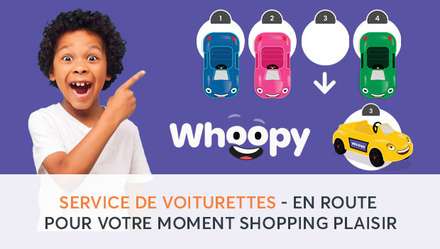 Bénéficiez d'un tarif préférentiel de 3€ au lieu de 5€, pour faciliter votre shopping tout en amusant vos enfants ! Colorées et confortables, les voiturettes whoopy font le bonheur des petits !